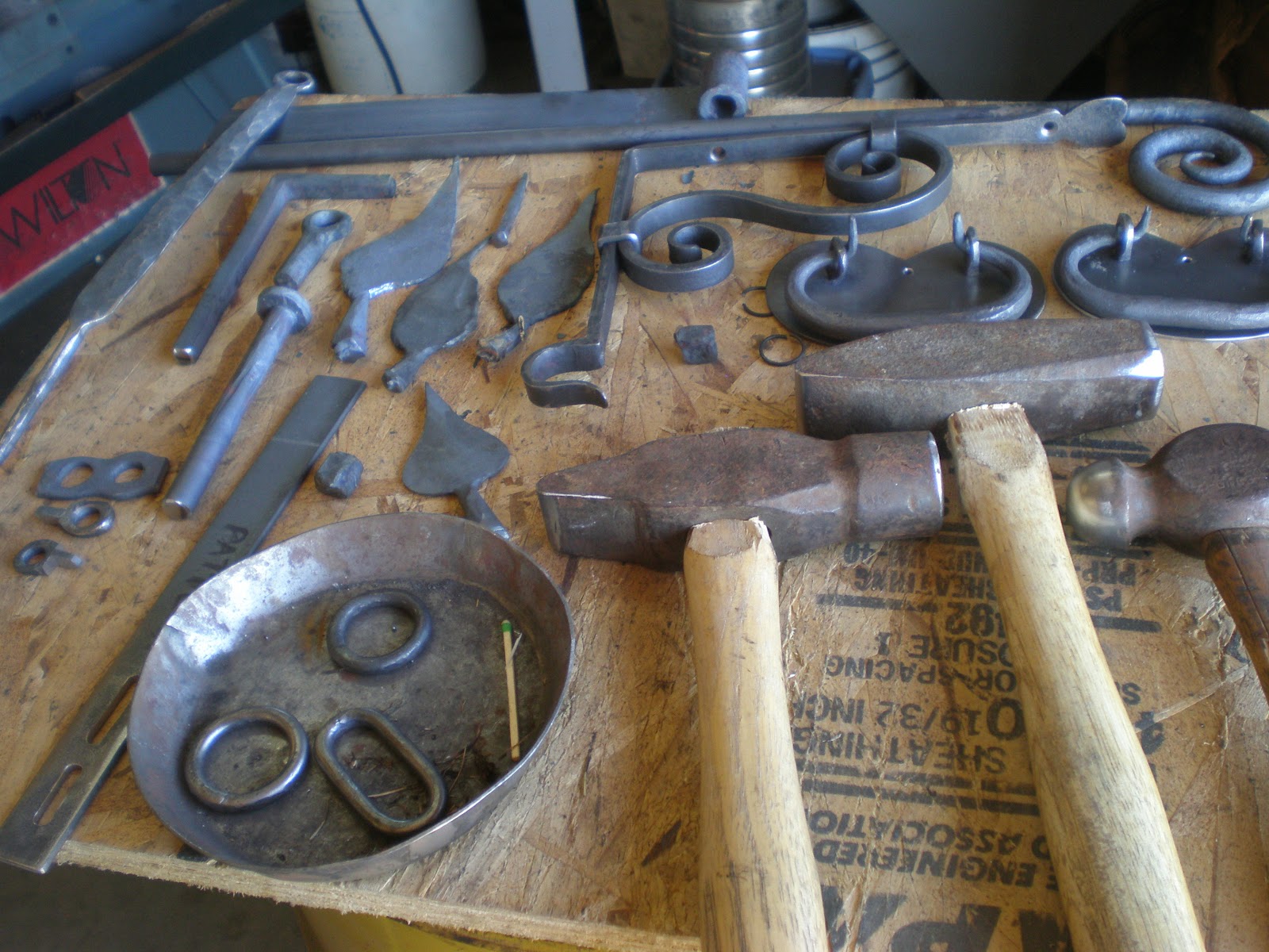 An example of items made by last weeks Seminar participant! Scroll, meat fork, trunk handles, trunk hings, scroll wall bracket, and forged rivet.